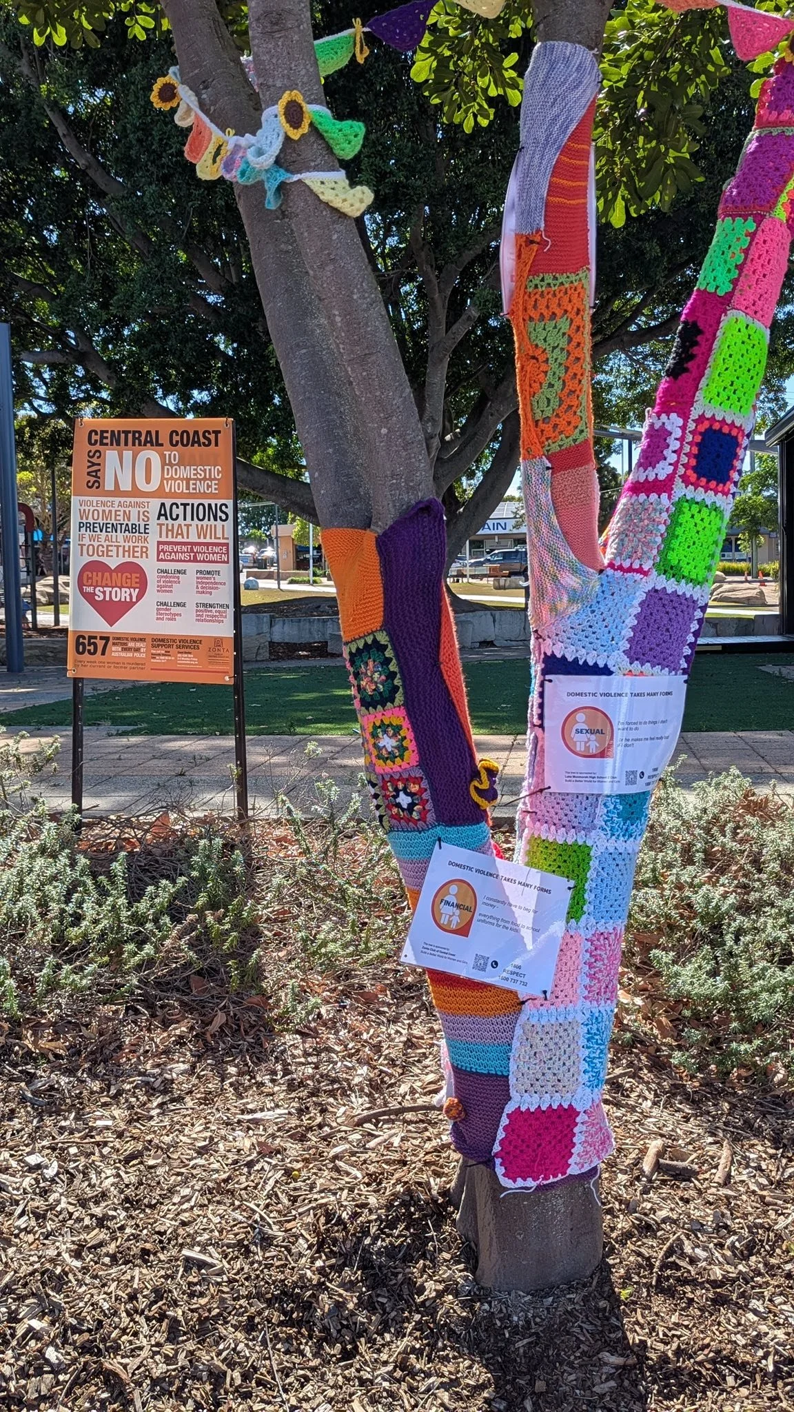 A Zonta CENTRAL COAST yarn bomb is a community advocacy project where members of the Zonta Central Coast organization wrap public trees and structures with colorful knitted or crocheted material to raise awareness about domestic and family violence. These installations, often part of the global 16 Days of Activism against Gender-Based Violence campaign, educate the public by providing messages and information about different forms of violence and how to seek help.